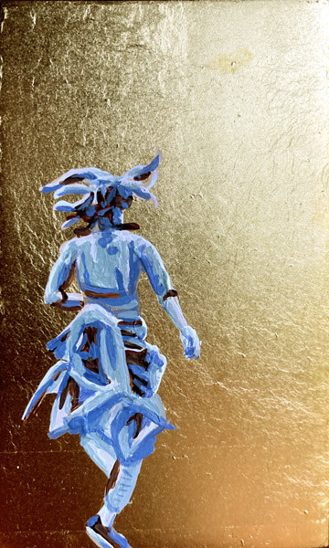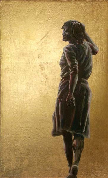 Denne serie er inspireret af de ortodokse kirkers ikonmalerier. I de seneste år er jeg ganske langsomt begyndt at forstå småbitte brudsykker af denne tradition - og hver gang har det været en berigelse. Mens figurerne på traditionelle ikoner ofte ser på os, har jeg valgt at lade mine figurer stille sig hen ved siden af os for sammen med os at rette blikket ind i den levende forgyldte flade, med alt hvad den betyder.